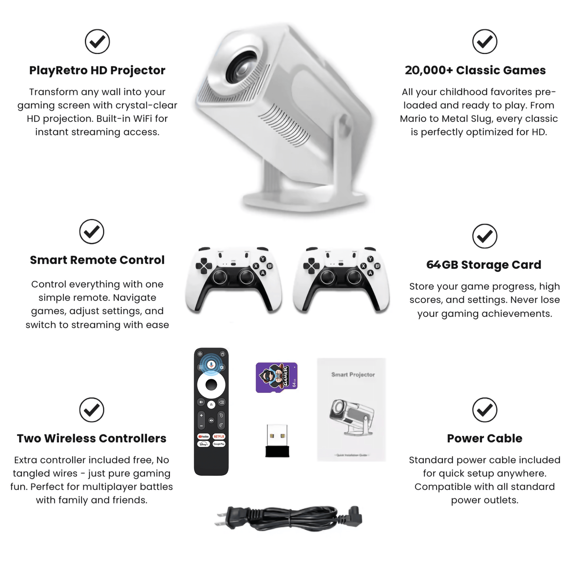 PlayRetro™ brings back the magic of your childhood with 20,000+ legendary games from 10+ classic consoles, perfectly optimized for your built-in HD projector.